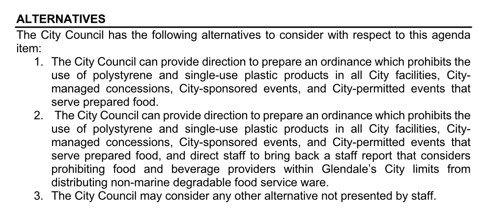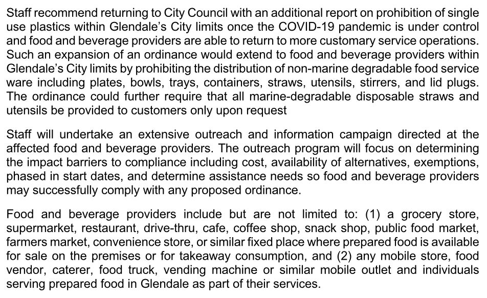 Glendale’s Sustainability Director David Jones presented the report, originally requested by Councilmember Brotman, which described the pervasive effects of Single Use Plastics and Polystyrene in our waste stream and environment, and shared staff’s recommended policy for implementing a ban of Polystyrene and Single Use Plastic within city facilities and for city events. Of note – the cost difference will be minimal, as most items required as replacements have very little cost increase, and those that do (such as marine degradable vs. plastic straws) will be provided only upon request. Policy Recommendation summary from the report: