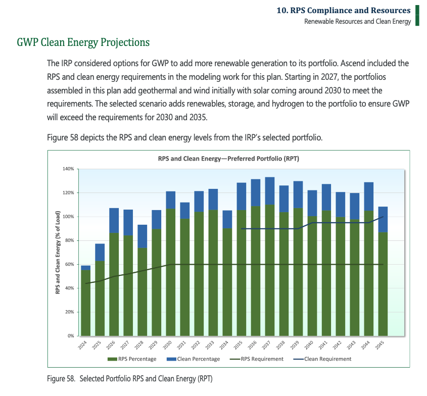 ▪ Tracking: Figure 57 Current Portfolio RPS and Clean Energy, GWP’s current portfolio mix. (Page 130 of IRP) says renewables + clean in 2024 would be 55% or so, going to 65% or more in 2025 and closer to 75% in 2026, then decreasing back to 55% or so in 2029.