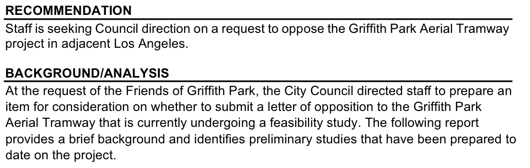 Proposed ordinance: https://glendaleca.primegov.com/Portal/viewer?id=2377&type=2 - Item 8a. Community Development, re: Request for letter opposing the proposed Griffith Park Tram Motion authorizing the Interim City Manager to prepare and send a letter in opposition to the Griffith Park Tram. REPORT