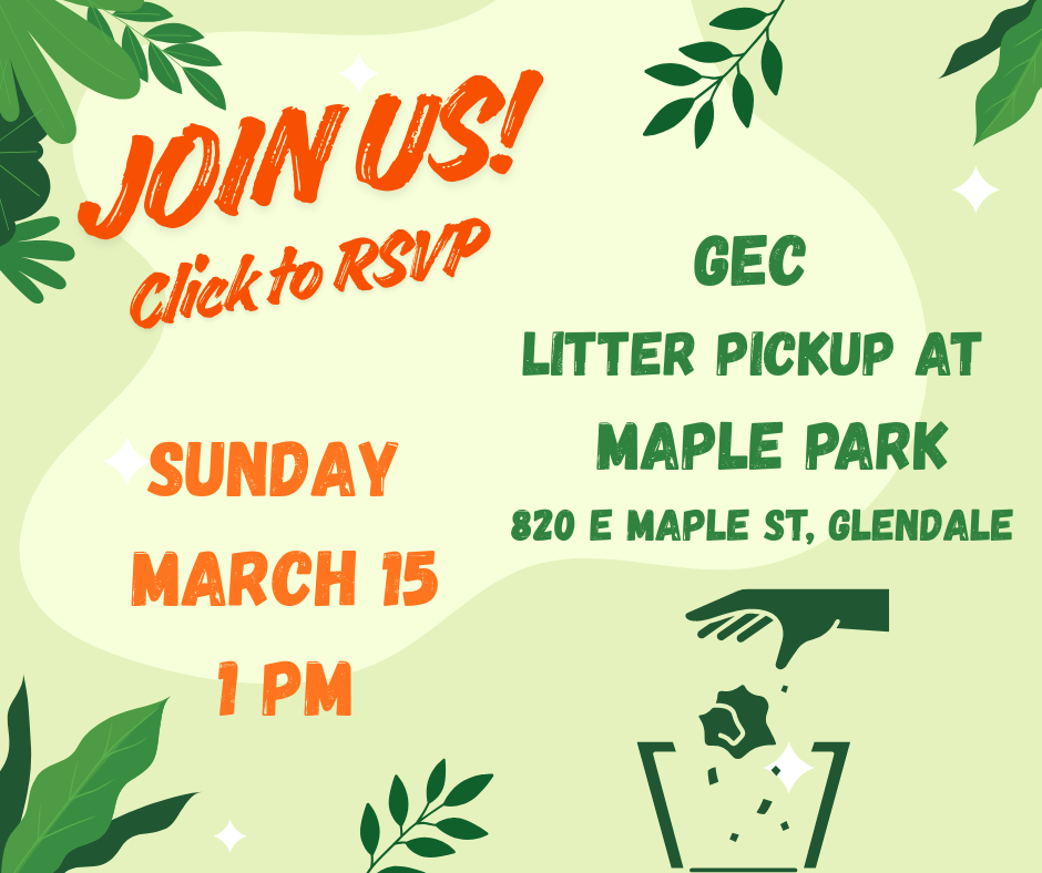 Join us as we take an hour or two to pick up trash in a different area of Glendale one day each month. Our next cleanup day will be Verdugo Park as part of Glendale’s 2026 Earth Day Festival on Saturday, April 4. Meet us at our GEC booth at 12:30! Grab your gloves, trash bag, water bottle, sunscreen, bring your neighbors, and join fellow community members who care about keeping Glendale clean, green, and the Jewel of the Verdugo! Children are welcome.