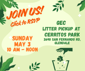 Join us as we take an hour or two to pick up trash in a different area of Glendale one day each month. Our next cleanup day will be at Maple Park on Sunday March 15 at 1pm. Grab your gloves, trash bag, water bottle, sunscreen, bring your neighbors, and join fellow community members who care about keeping Glendale clean, green, and the Jewel of the Verdugo! Children are welcome.